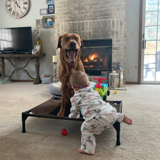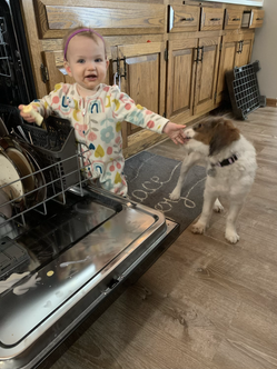 Obviously Mack is her favorite, but she really loves dogs in general! When we FaceTime my parents, she asks to see Roscoe, their pup. Every time we go to the kitchen she says "woof", which is her telling me she wants to check on our client dogs. Lainey wants to check on them multiple times a day. She gives them ice and showers them with so many hugs and kisses.